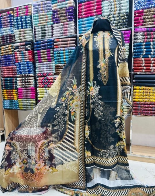 এই কালো ও সোনালি রঙের থ্রি পিসে আছে রাজকীয় ফিনিশিং ও নরম কটন কাপড়ের নিখুঁত মিশ্রণ।